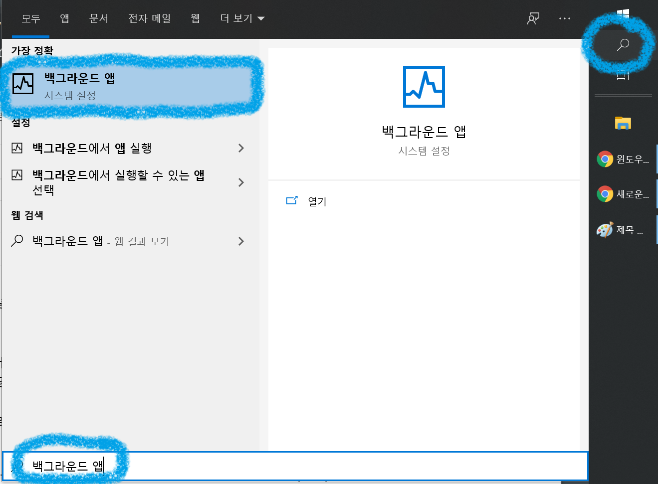 백그라운드 앱이라고 뜨는 메뉴를 클릭을 합니다. 그럼 아래와 같은 화면이 나옵니다.