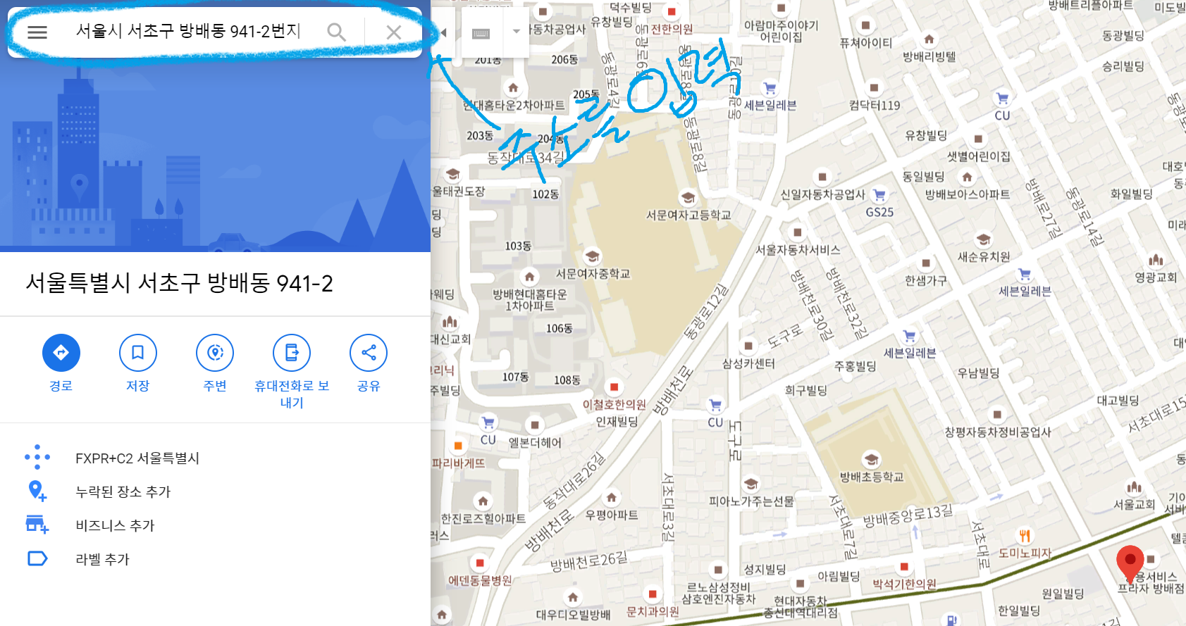 주소 검색을 통해서도 위도 경도를 찾을 수가 있습니다.