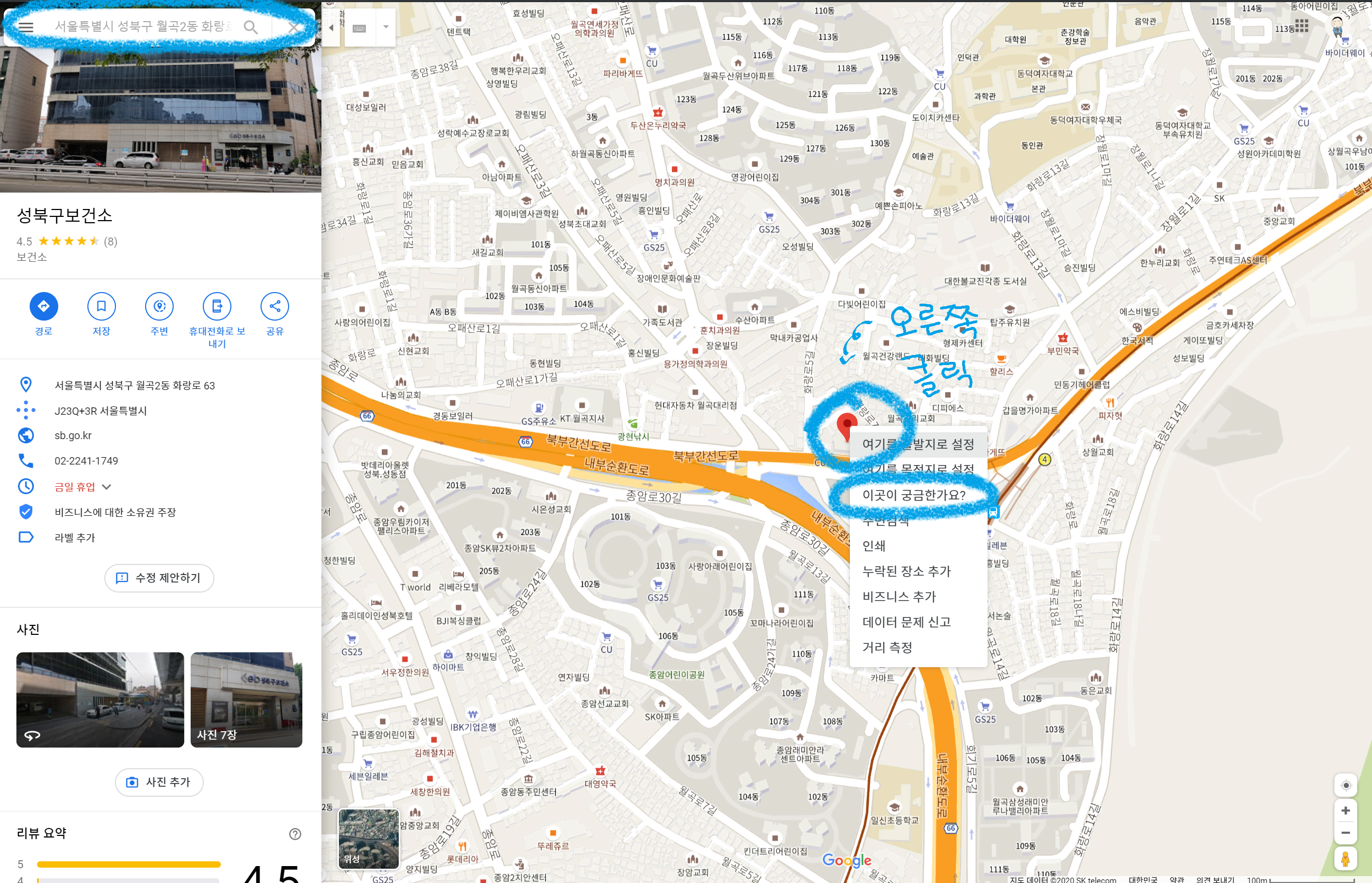 아래와 같이 위치를 검색을 합니다.(저는 성북구 보건소를 검색합니다.)